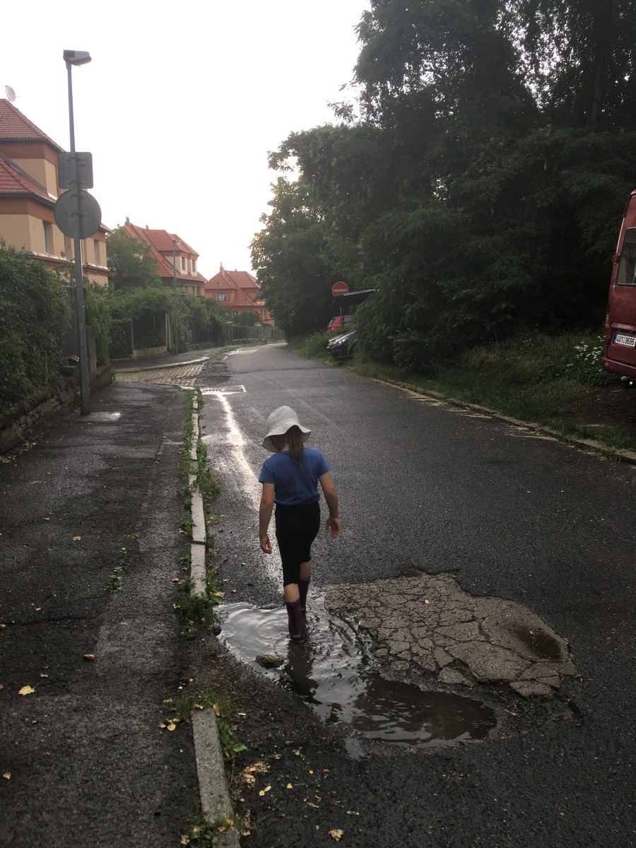 Takže jedeme s Olinkou autobusem nahoru a povážlivě se stmívá. Říkám si, že potřebujeme 15 minut, než doběhneme ze školky. Tak nic, nevyjde to. Na Schodové začíná kapat a mezi Cibulkou a školkou se spouští hustý liják. Z autobusu vidím, jak Tonda u nás akorát leze přes plot. Přebíháme do školky, kde už jede slušná party poobědových, kteří tam uvízli. Volám sousedům, jestli jsou doma, ať Tondovi otevřou a pustěj ho domů (mají naše klíče). Jsou do neděle pryč. Soused zkouší volat synovi, jestli není doma. Není. Padají kroupy. Zkouším kamarádku přes ulici, aby ho vzala k sobě. Nebere telefon. Začínám panikařit. Pak mě napadne spásná myšlenka nechat holky ve školce a seběhnout v dešti zachránit synka a pak se pro holky vrátit. Nakonec mě bere autem jeden tatínek a mezitím volají sousedi, že sehnali jediného člověka, který je u nás v baráku doma a že je Tonda u něj. Tondu vyzvedávám, pouštím ho domů. měním sandály za holiny, holkám je beru do tašky a řídnoucím deštěm se vracím do školky.