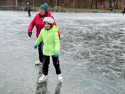 Zima začala slibně hned v prosinci, ale dál to žádná velká hitparáda nebyla. Ale aspoň začalo mrznout, až praštělo, tak jsme mohli zas provětrat brusle. Tonda byl na přespávačce u kamaráda z tábora, nebo nevím, každopádně stačilo od kamarádky půjčit brusle pro Haničku a mohli jsme vyrazit. Mám ráda zimu se vším všudy, ale na druhou stranu tak hladký a průzračný led, jaký díky holomrazu bez sněhu pokryl náš rybníček, jsem ještě snad nezažila. Oproti narvanému kluzišti s rozbitým ledem to jelo jak namydlený blesk, na rybníku byl celý kopec, hrál se hokej, kroužilo se mezi stromy a kolem ostrůvku a za dvě hodiny jsme toho měli tak akorát a mohli jsme jít domů. Žít Košíře.